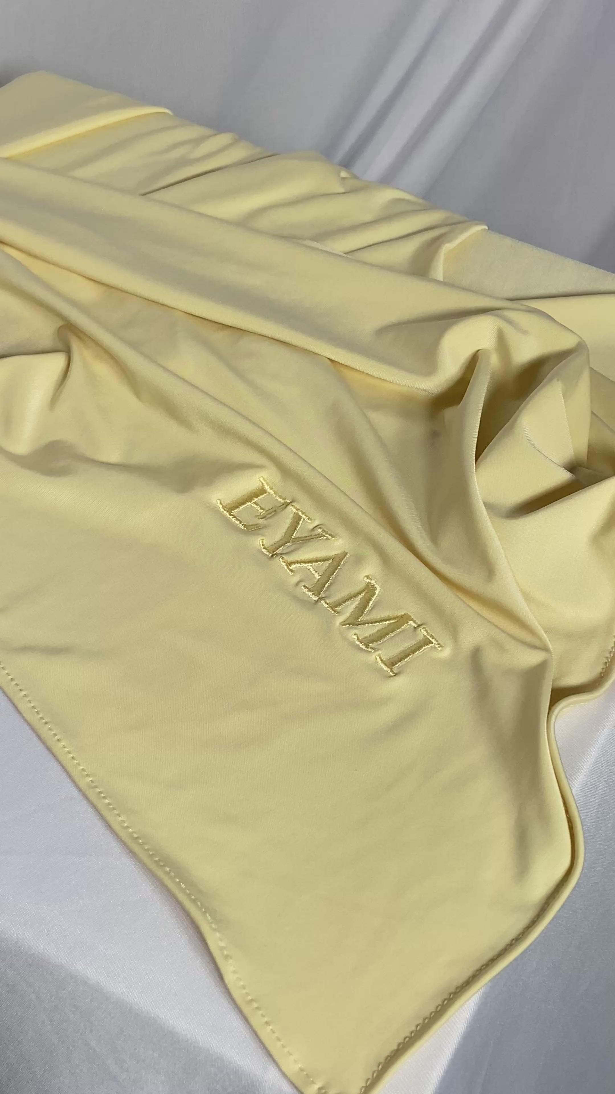 • Liquide Jersey : Matière extensible et fluide, avec une subtile touche de brillance. Une broderie "EYAMI" est discrètement placée sur le côté du hijab.